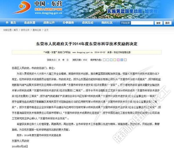 《東營市(shì)人民政府關(guān)于2014年度東營(ying)市科學技術(shù)獎勵的決定(dìng)》
