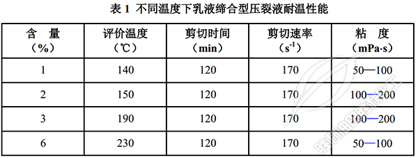 乳(rǔ)液締合型壓裂(liè)液可用于 150℃~230 ℃地層(ceng)溫度 (見表 1)。