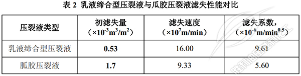 壓裂液的(de)濾失性是影響(xiǎng)壓裂液造縫能(neng)力的重要因素(su),利用濾失儀在(zài)實驗室條件下(xia),對乳液締合壓(yā)裂液與常規瓜(guā)膠壓裂液濾失(shī)性能對比 (表 2 )。