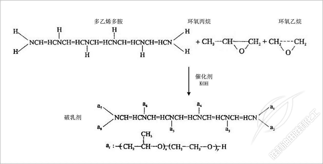 項(xiang)目以帶(dai)有多個(gè)活潑氫(qīng)的多乙(yǐ)烯多胺(an)爲起始(shǐ)劑,在固(gù)體KOH催化(hua)劑作用(yong)下與環(huan)氧丙烷(wan)、環氧乙(yǐ)烷聚合(hé)反應制(zhì)備分子(zǐ)量低于(yu)1000的聚醚(mi)類破乳(ru)劑,并通(tong)過控制(zhi)投料比(bǐ)例制備(bèi)分子量(liang)在300~500的破(pò)乳劑A和(hé)分子量(liàng)在700~900的破(po)乳劑B。其(qi)主要反(fan)應方程(chéng)式爲: