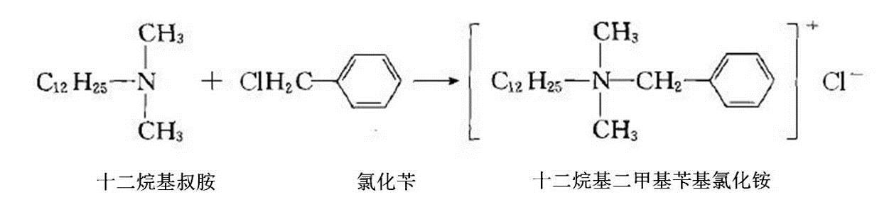 (1)反應原(yuan)理及反(fan)應方程(cheng)式:采用(yong)十二烷(wan)基叔胺(àn)與氯化(hua)苄反應(ying)合成十(shí)二烷基(jī)二甲基(jī)苄基氯(lǜ)化铵,反(fǎn)應方程(chéng)式如下(xià)。