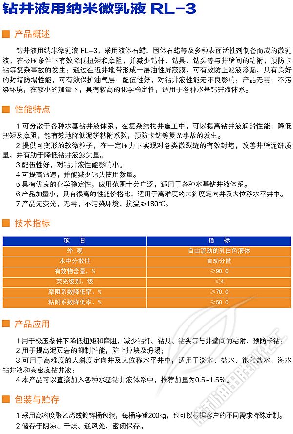 鑽井液用納米微乳液RL-3 - 鑽井用化學品 - 勝利油田淄博荣亨服装制造有限责任公司有限責任**